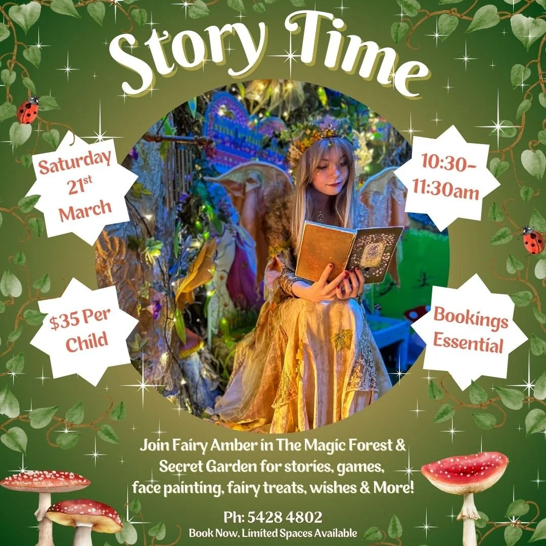 Visit The Fairies in The Magic Forest and Secret Garden for 1hr of Story Time for all ages or school aged children can enjoy our 3hr Art & Craft Workshop.